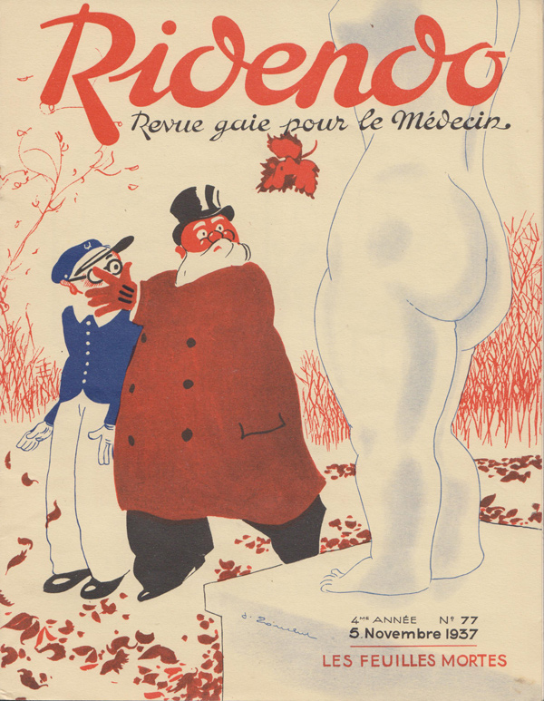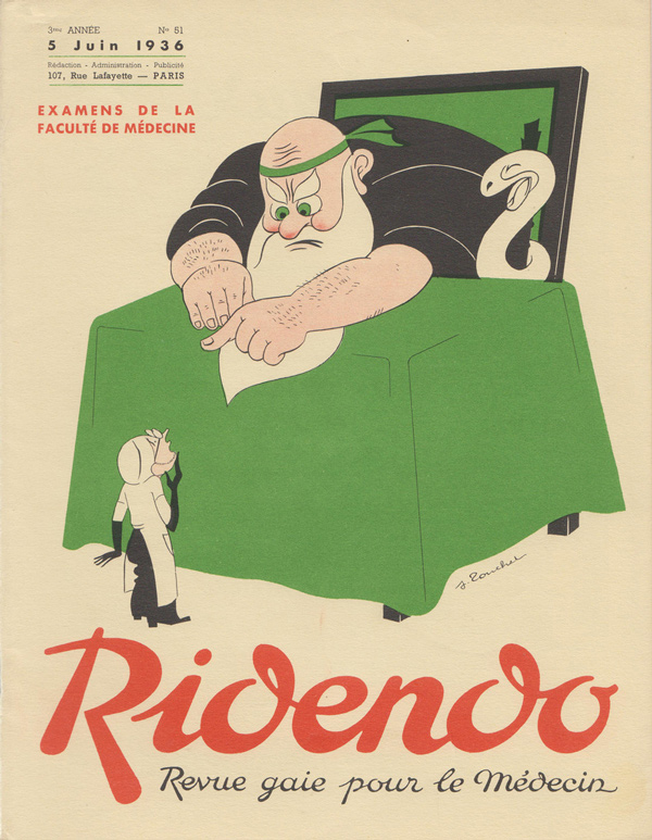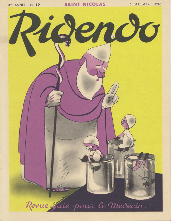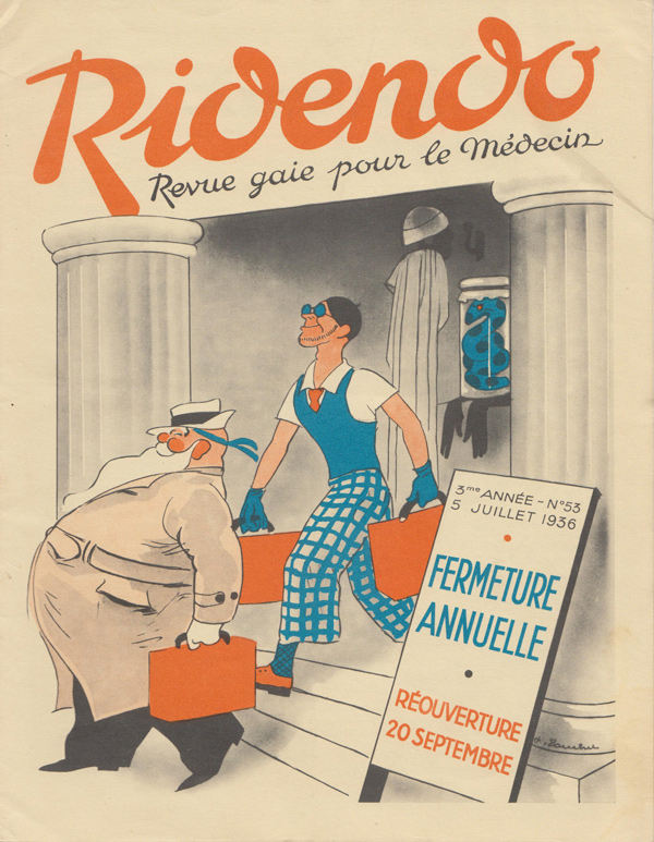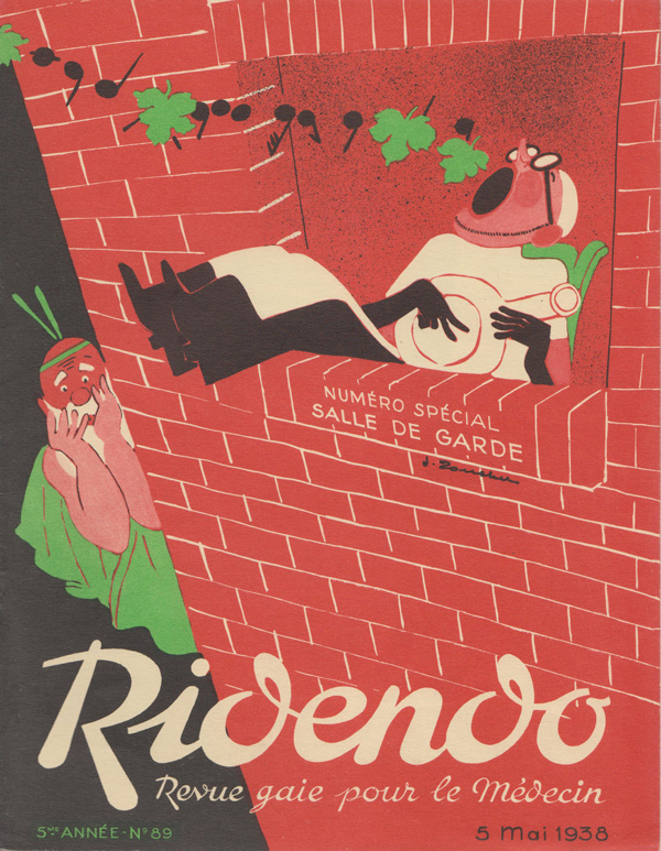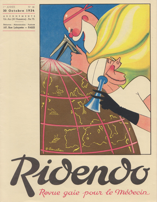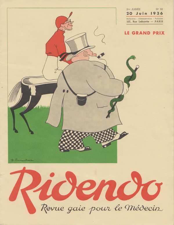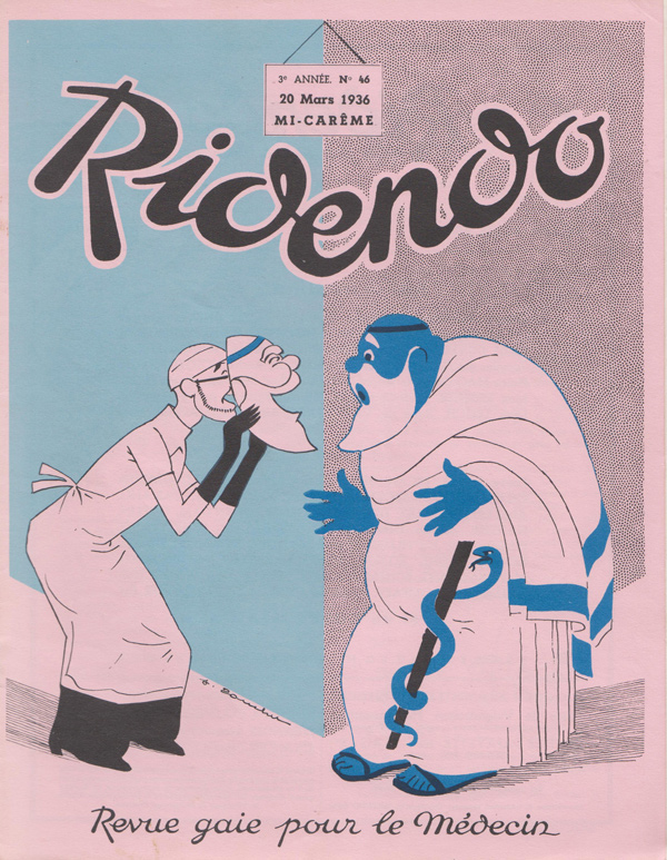 Ridendo (derived from the French verb 'rire,' to laugh) was a medical and humor magazine distributed to French physicians from 1933 to 1977, reaching around 450 issues. The first 139 covers were made by illustrator and commercial artist Jacques Touchet (who also published several books in the early fifties, and worked with another french magazine called L'illustration). The covers always picture a physician along with a sympatethic version of Esculape, Latin god of medicine.
