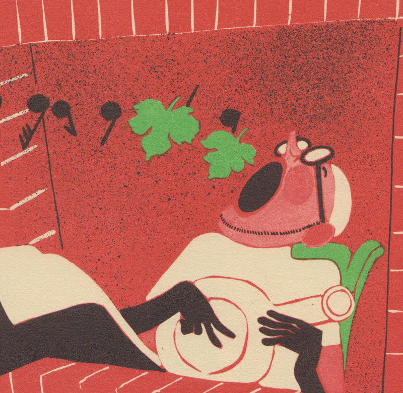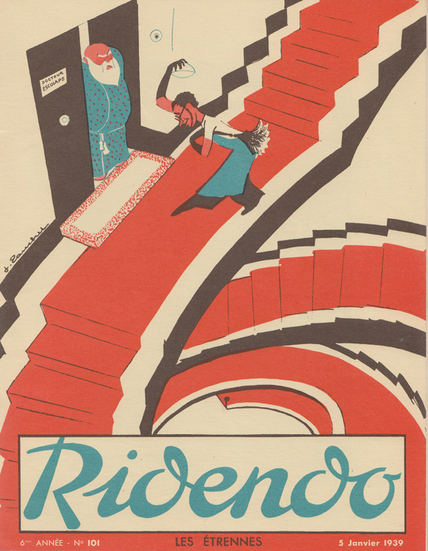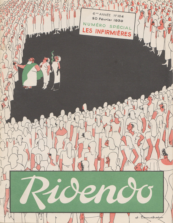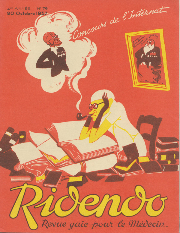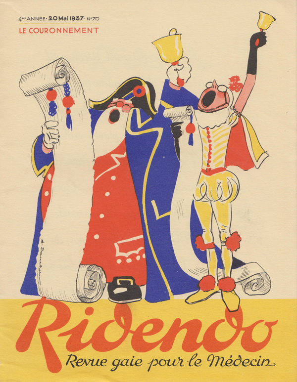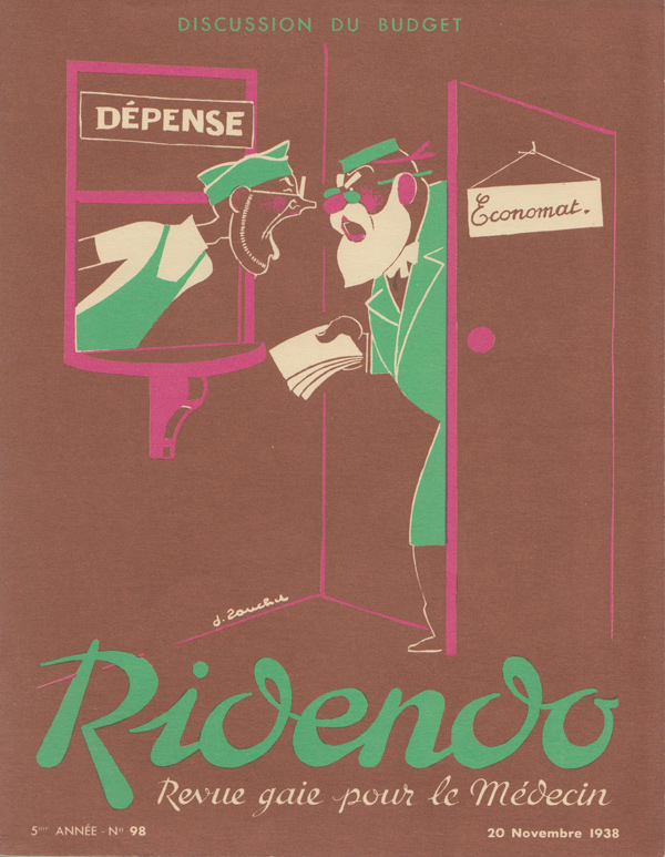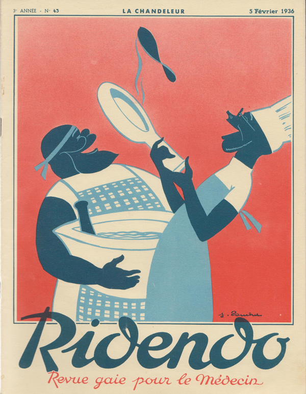 Ridendo (derived from the French verb 'rire,' to laugh) was a medical and humor magazine distributed to French physicians from 1933 to 1977, reaching around 450 issues. The first 139 covers were made by illustrator and commercial artist Jacques Touchet (who also published several books in the early fifties, and worked with another french magazine called L'illustration). The covers always picture a physician along with a sympatethic version of Esculape, Latin god of medicine.